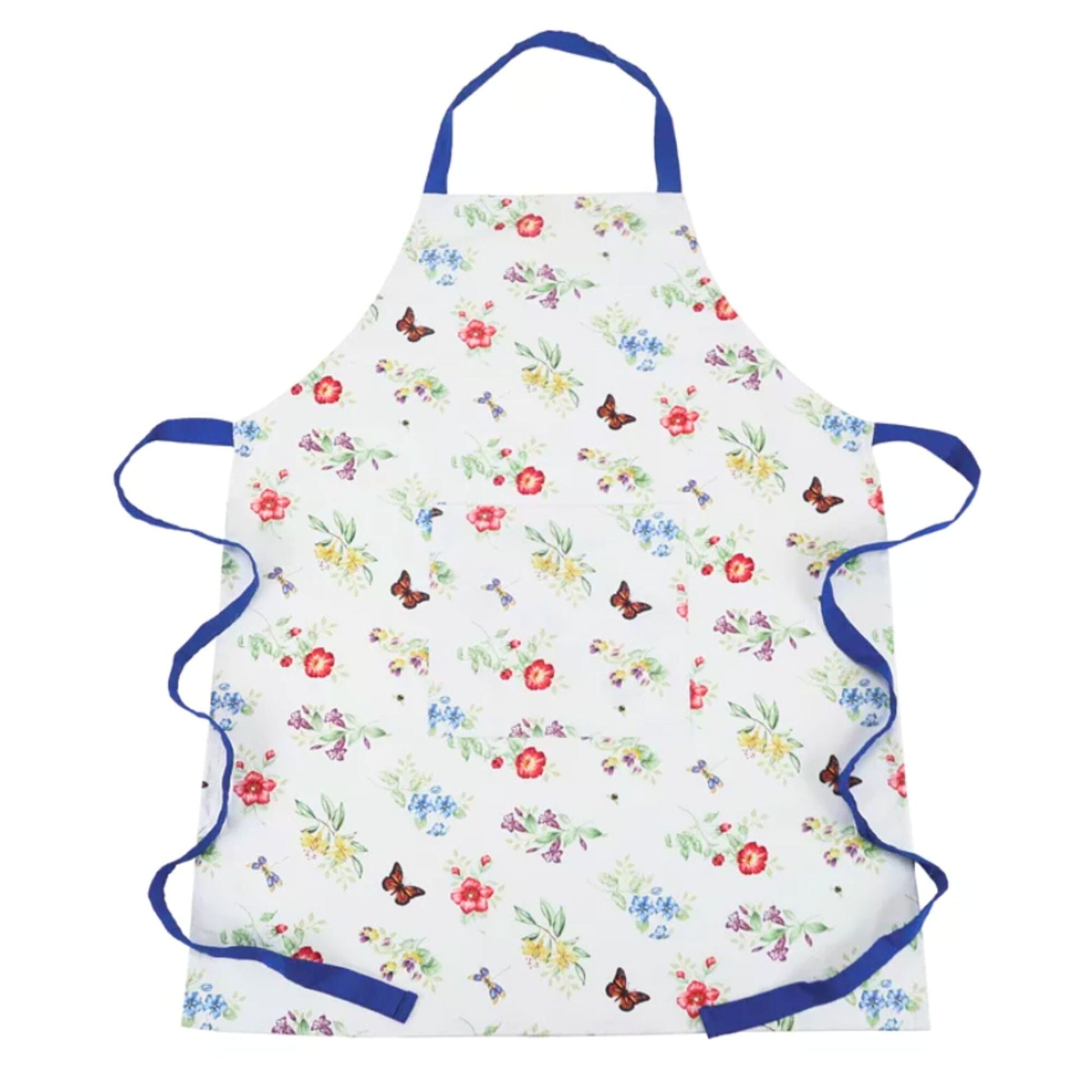 Add a touch of garden-inspired charm to your kitchen with the Lenox Butterfly Meadow Apron. Featuring colorful butterflies, dragonflies, and bumblebees fluttering among vibrant florals, this apron is accented with delicate pink trim for a fresh, feminine touch. Measuring 26" x 33", it provides comfortable coverage for cooking, baking, and entertaining. Made from soft, machine-washable cotton, it’s both stylish and practical—perfect for everyday use or gifting. An ideal hostess gift for home cooks, entertainers, or Butterfly Meadow collectors, and a beautiful complement to the full Butterfly Meadow collection.