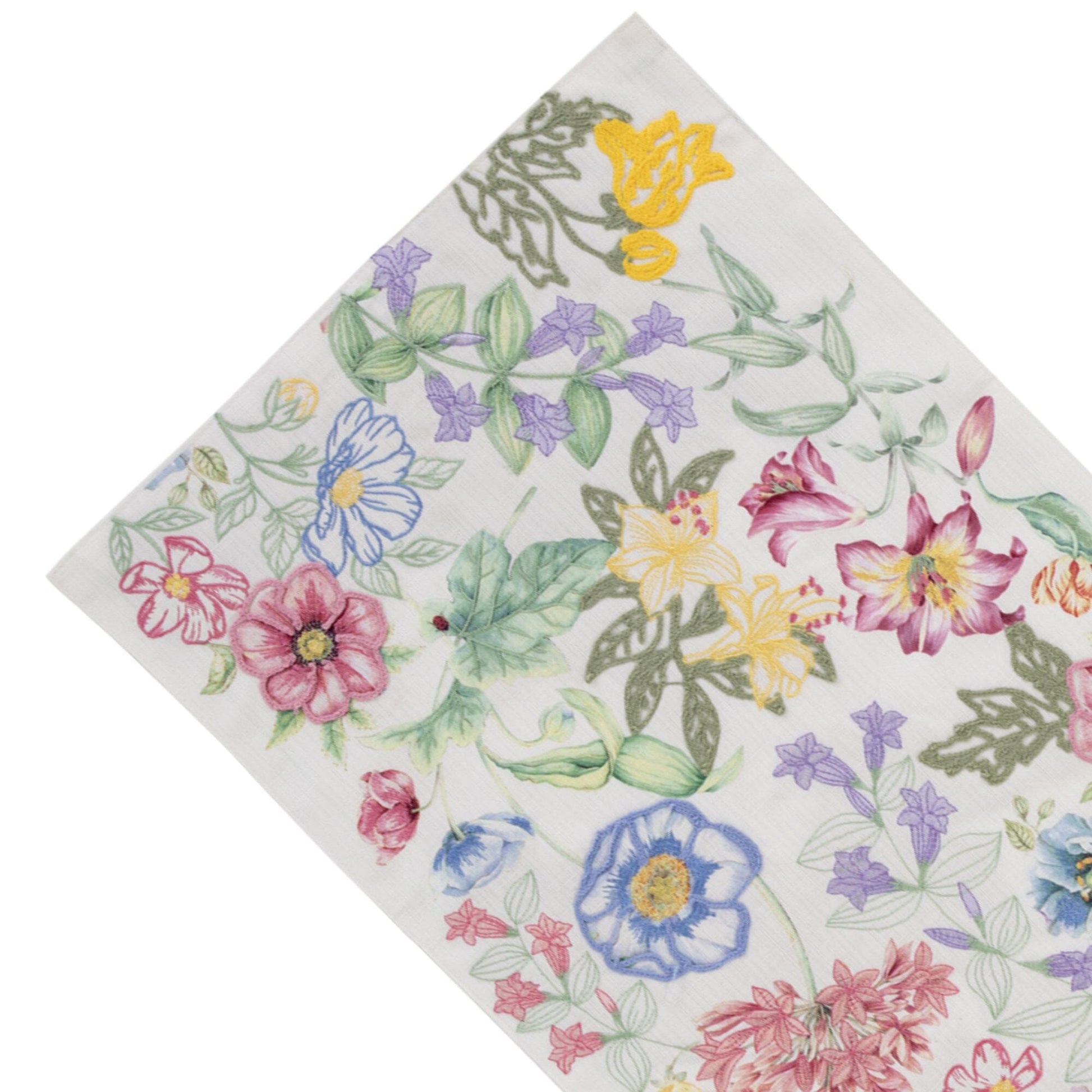 Bring the vibrant beauty of a blooming garden to your table with the Butterfly Meadow Garden Embroidered Centerpiece. Designed with intricate floral embroidery in vibrant shades of pink, yellow, blue, and green, this centerpiece runner beautifully captures the look of a blooming spring meadow. Crafted from 100% polyester, it combines durability with sophistication, making it effortless to create a garden party atmosphere for every gathering. The embroidered floral design adds an elevated touch of texture and artistry, perfect for adding charm and style to your dining décor.