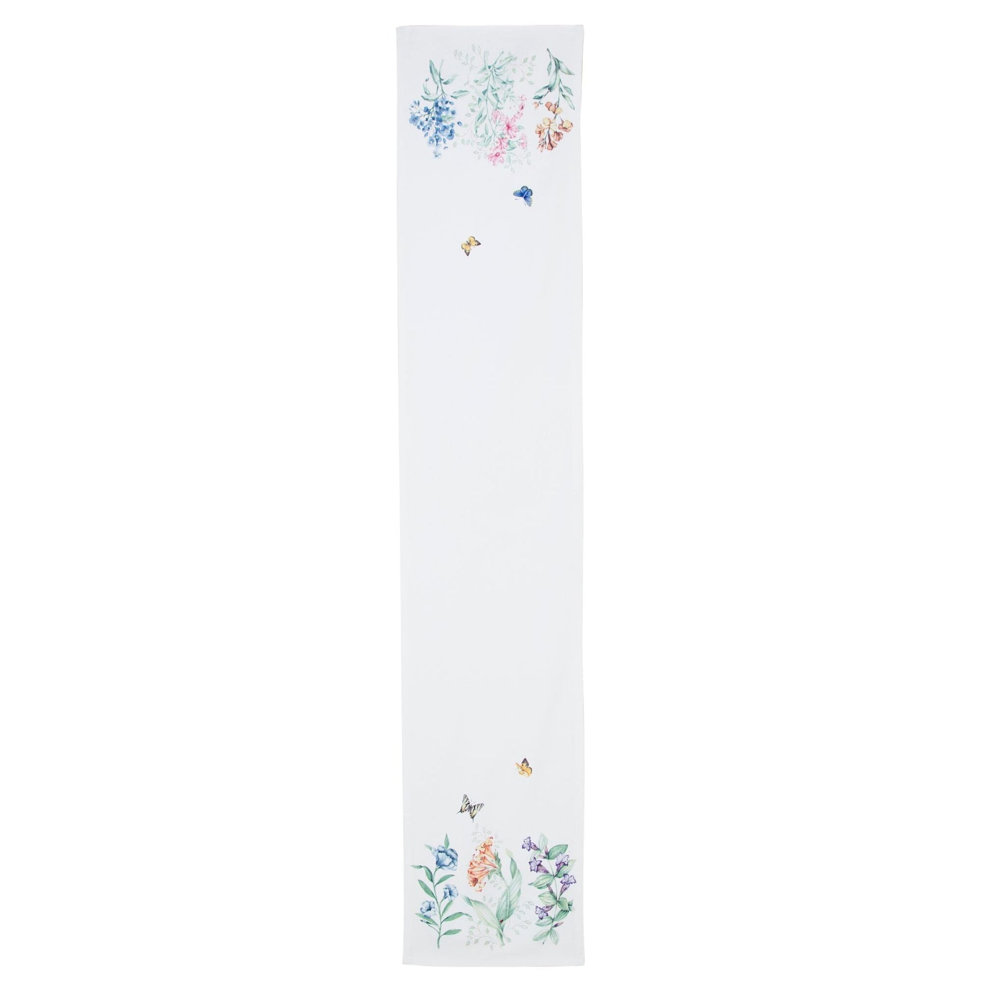 Bring the beauty of the garden to your table with these beautifully detailed table runner from the Lenox Butterfly Meadow collection. Featuring a delicate watercolor-style print of vibrant flowers and fluttering butterflies, this console runner captures the essence of spring and summer dining. Designed on a soft white ground, the nature-inspired artwork pops with color and detail, creating an inviting table setting for both everyday meals and special occasions. Made from 100% polyester, this runner is not only soft to the touch but also durable, wrinkle-resistant, and machine washable, making it perfect for effortless, long-lasting use. Ideal for spring table décor, garden party settings, or holiday gatherings, this dining table runner pairs perfectly with the matching Butterfly Meadow tablecloth, napkins and placemats for a coordinated, seasonal look.