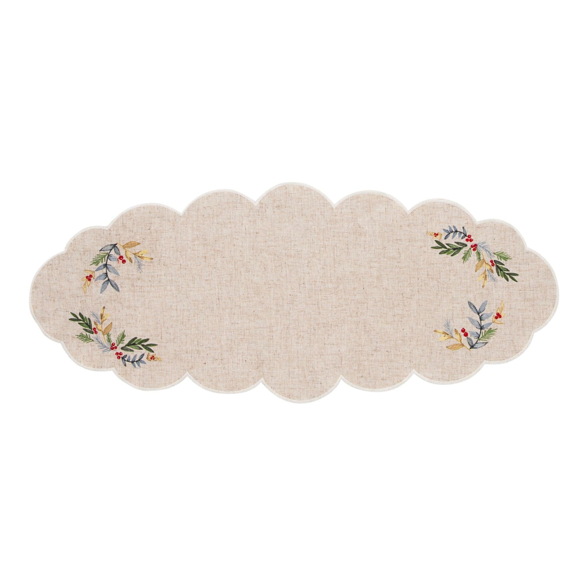 Elegant Embroidered Design: Features a delicate holly and berry motif in red, green, and blue, framed by a scalloped border.
