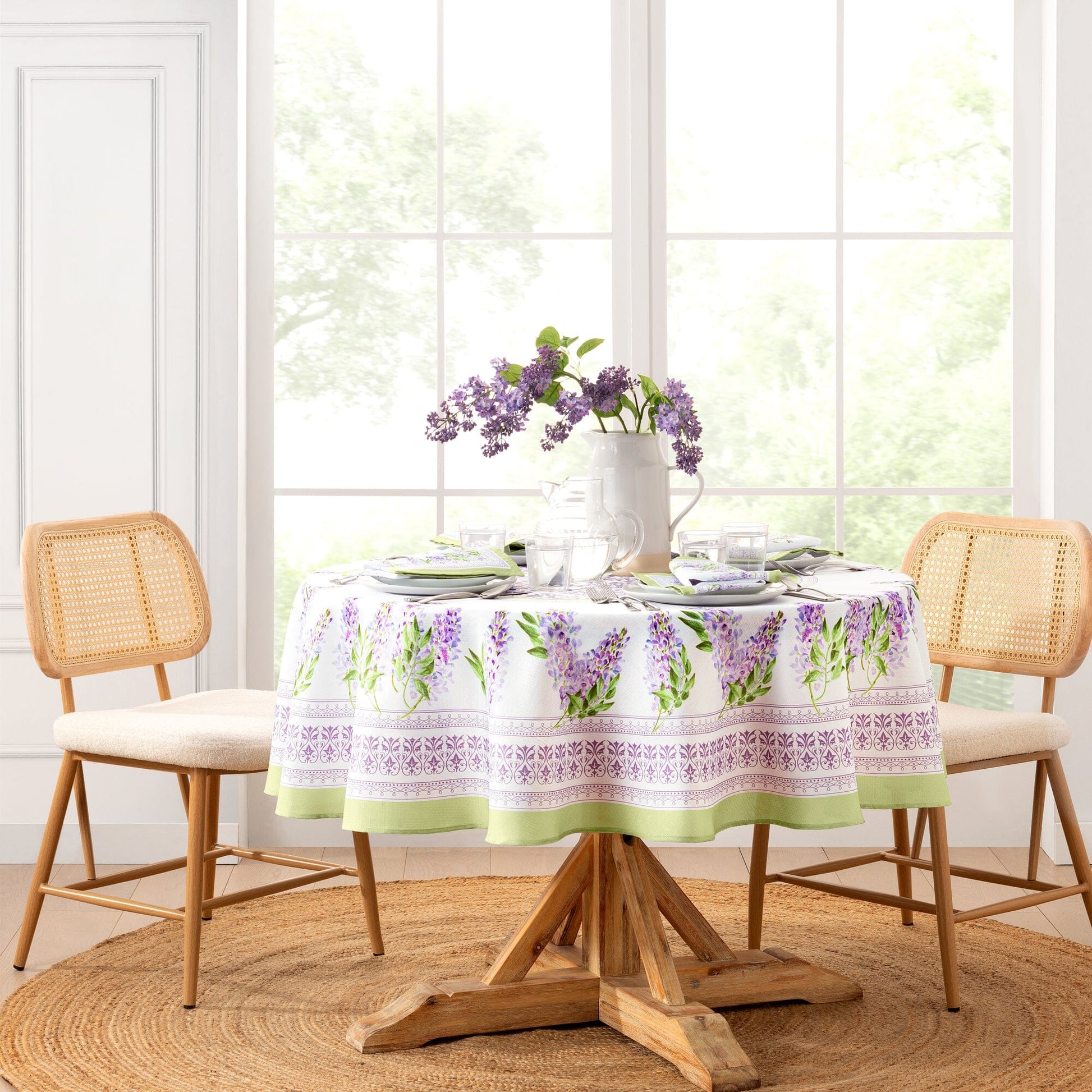 Transform your dining experience with our lovely Lilac Garden Tablecloth, where the beauty of nature meets timeless design. Featuring delicate lilac blossoms gracefully cascading along a lace inspired, floral fleur-de-lis style border, this engineered fabric tablecloth brings the tranquility of a blooming garden right to your table. The soft lavender, pale sage green, and white hues, combined with a geometric center pattern of lilac floral trellis motifs, create a serene, garden-inspired atmosphere. Perfect for hosting a garden brunch, an elegant dinner party, or a cozy family gathering, this classic floral table linen adds a touch of the French countryside to your spring and summer decor. Made from 100% polyester, this tablecloth is both wrinkle-resistant and durable, offering softness that ensures it will last for years. Available as a single tablecloth in various sizes and shapes, including rectangle and round. Elevate your table setting by adding our coordinating Lilac Garden Tablecloth napkins, available for purchase separately.