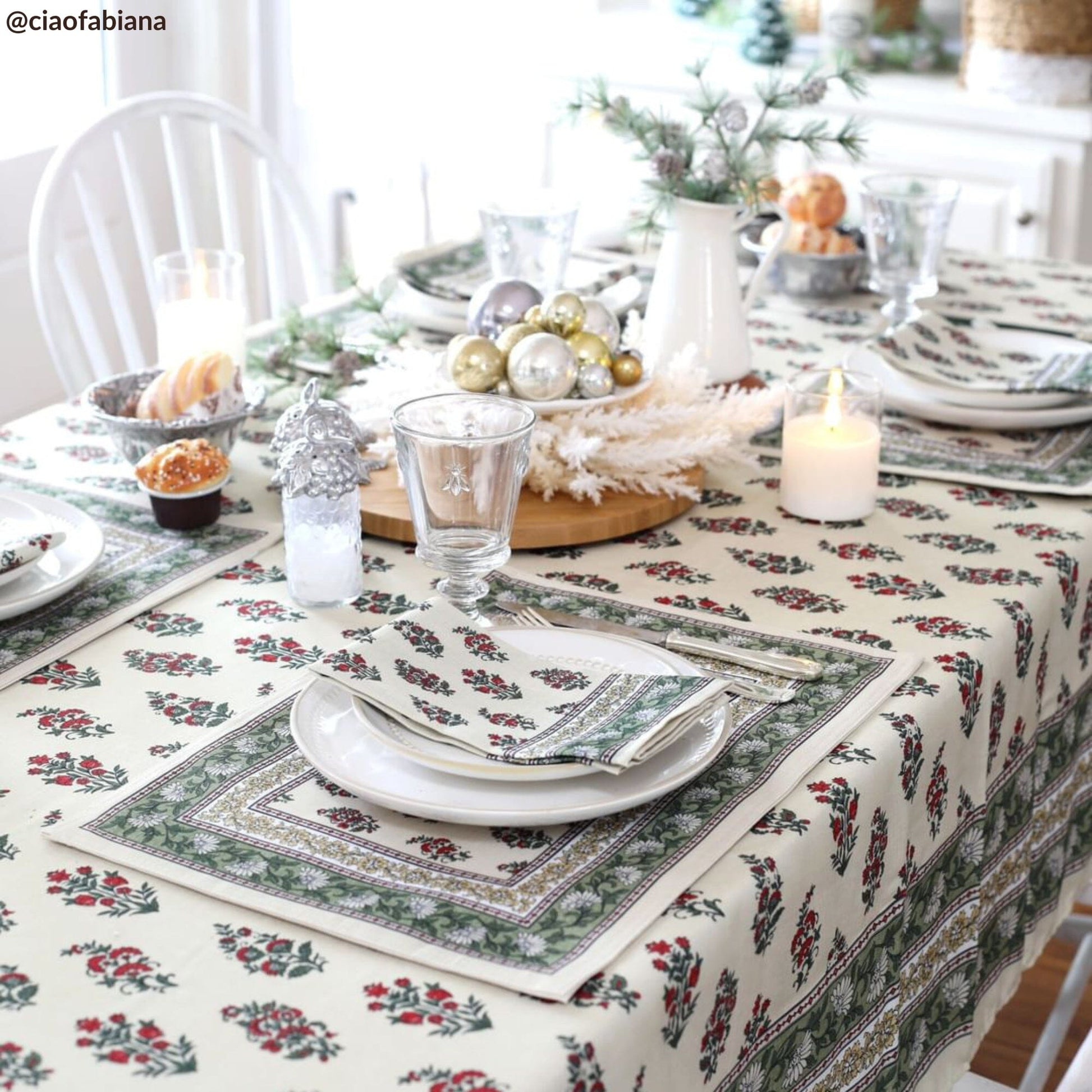 Placemats are sold as a set of four, measuring 13 inches by 19 inches. Coordinating tablecloth, napkins, and runner are sold separately.