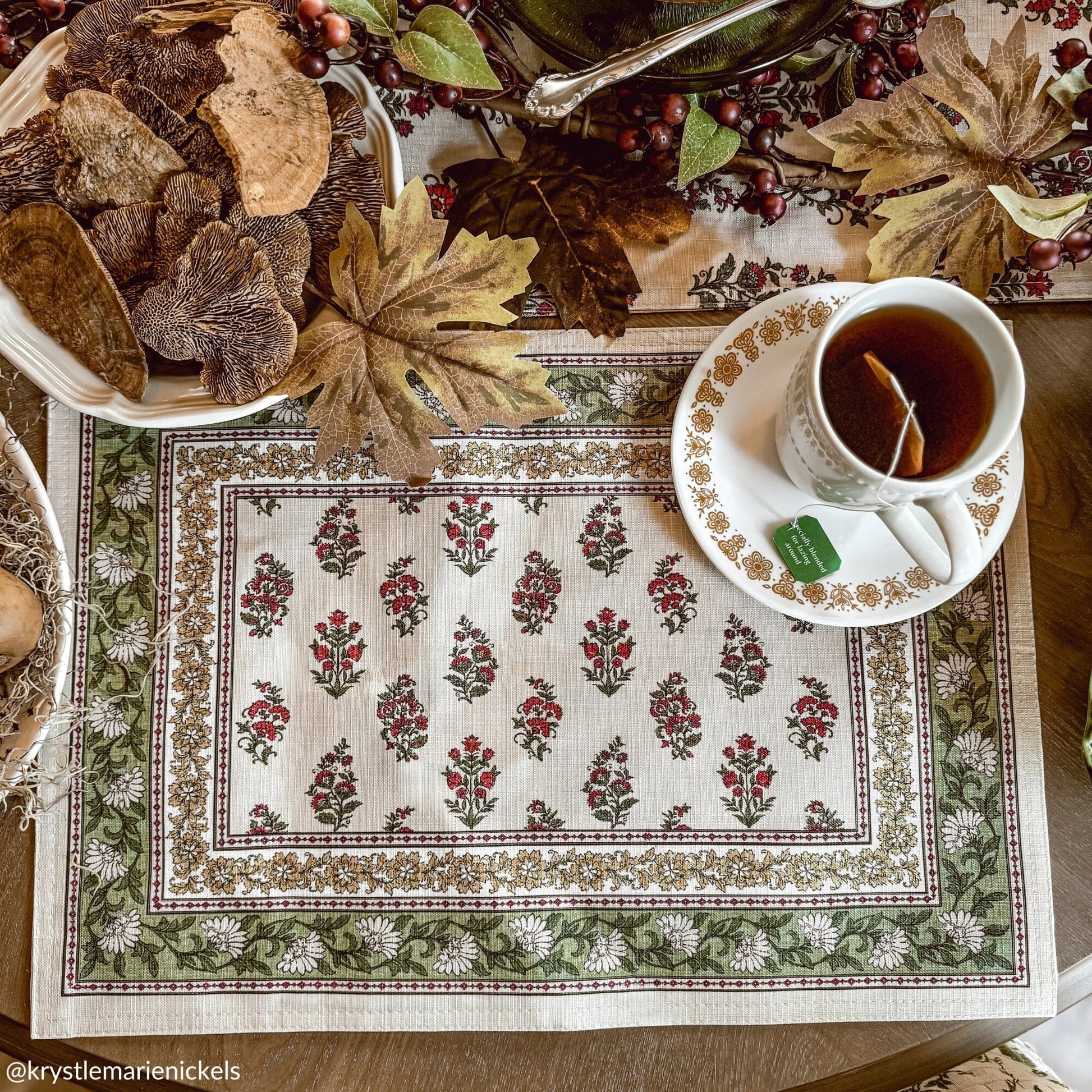 Elevate your dining experience with our Nomad Harvest Block print artisanal style place mats. Designed to bring a touch of casual elegance to your Fall or everyday table setting, this set of reversible table mats has been crafted with meticulous attention to detail and features a paisley block print design in shades of red and olive green on a solid beige ground, complimented by an ornate border design. Constructed from 100% polyester, these reusable placemats are machine washable and dryer safe. Placemats measure 13”x19” and are sold as a set of 4. Easy care, machine washable. Coordinate to Nomad Harvest Block Print napkins, tablecloth, and table runner to complete the look.