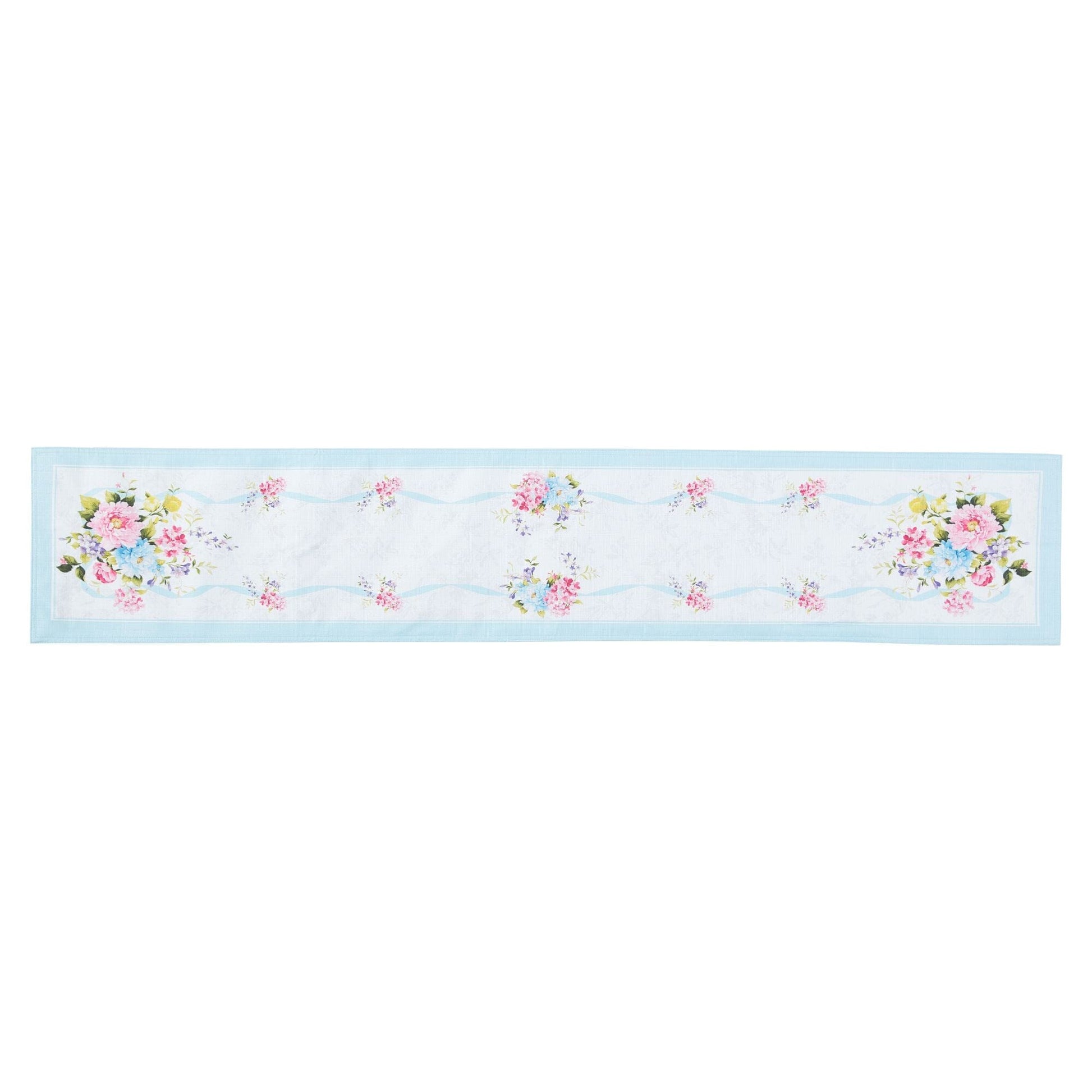 Bring a fresh, springtime feel to your tablescape with the Rose Cottage Floral Table Runner. Crafted with meticulous attention to detail, this elegant table runner features delicate pink, purple, blue, and yellow blooms, accented by greenery, soft ribbons, and subtle floral outlines against a crisp white ground with a baby blue border design. Perfect for hosting brunches, tea parties, baby & bridal showers, Mother’s Day, Easter or simply everyday meals throughout the spring and summer seasons. Crafted from high-quality, wrinkle free 100% polyester fabric, this cloth runner is not only beautiful but also durable, making it a timeless addition to your home. Sold as a single runner; ideal for use as a table, console, mantle or buffet runner. Complete the look by adding our coordinating Rose Cottage Floral tablecloth, placemats, and napkins to your collection, available separately.