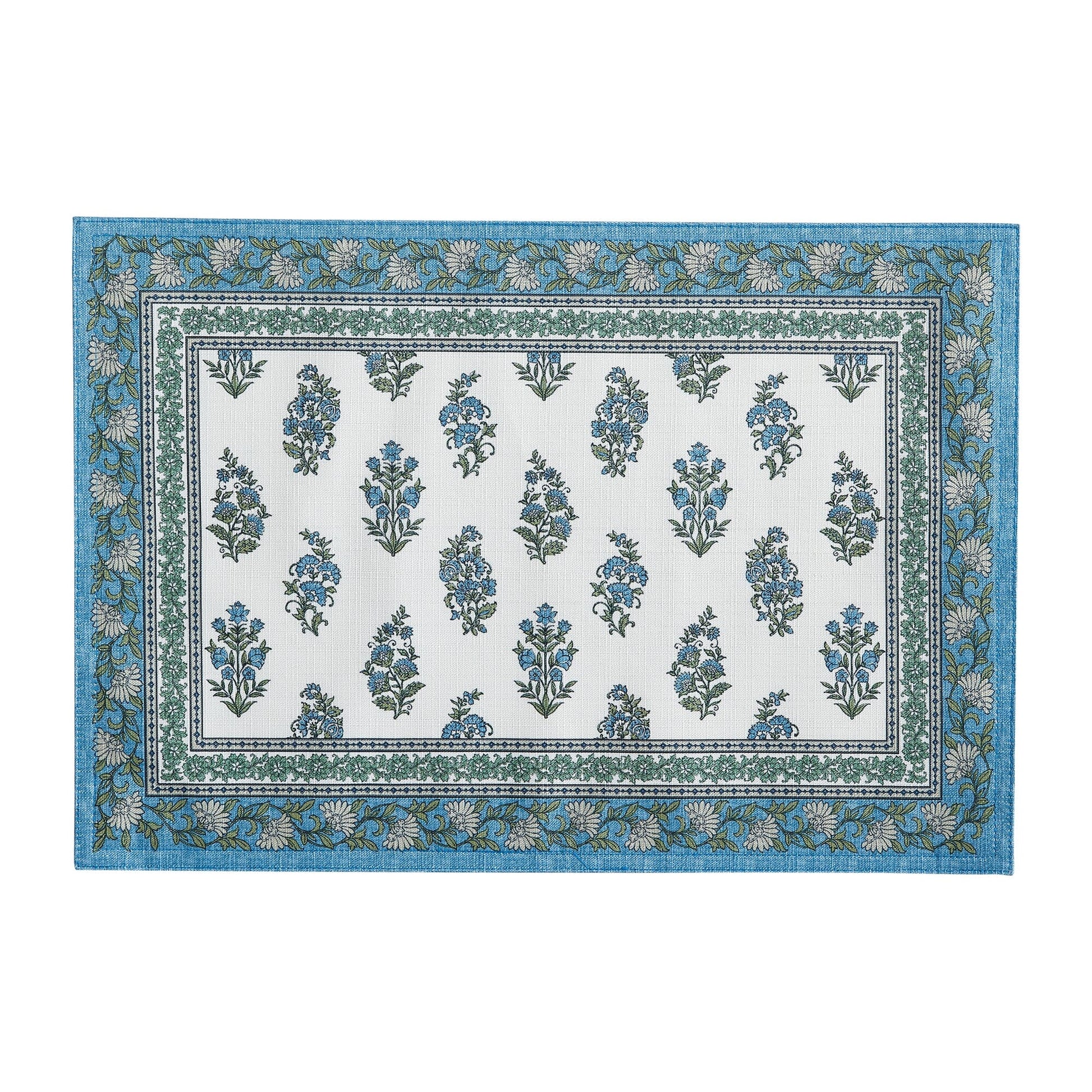 Presenta un diseño ecléctico con estampado de cachemira en tonos cálidos de azul y verde sobre un fondo blanco sólido complementado con un borde elegante.