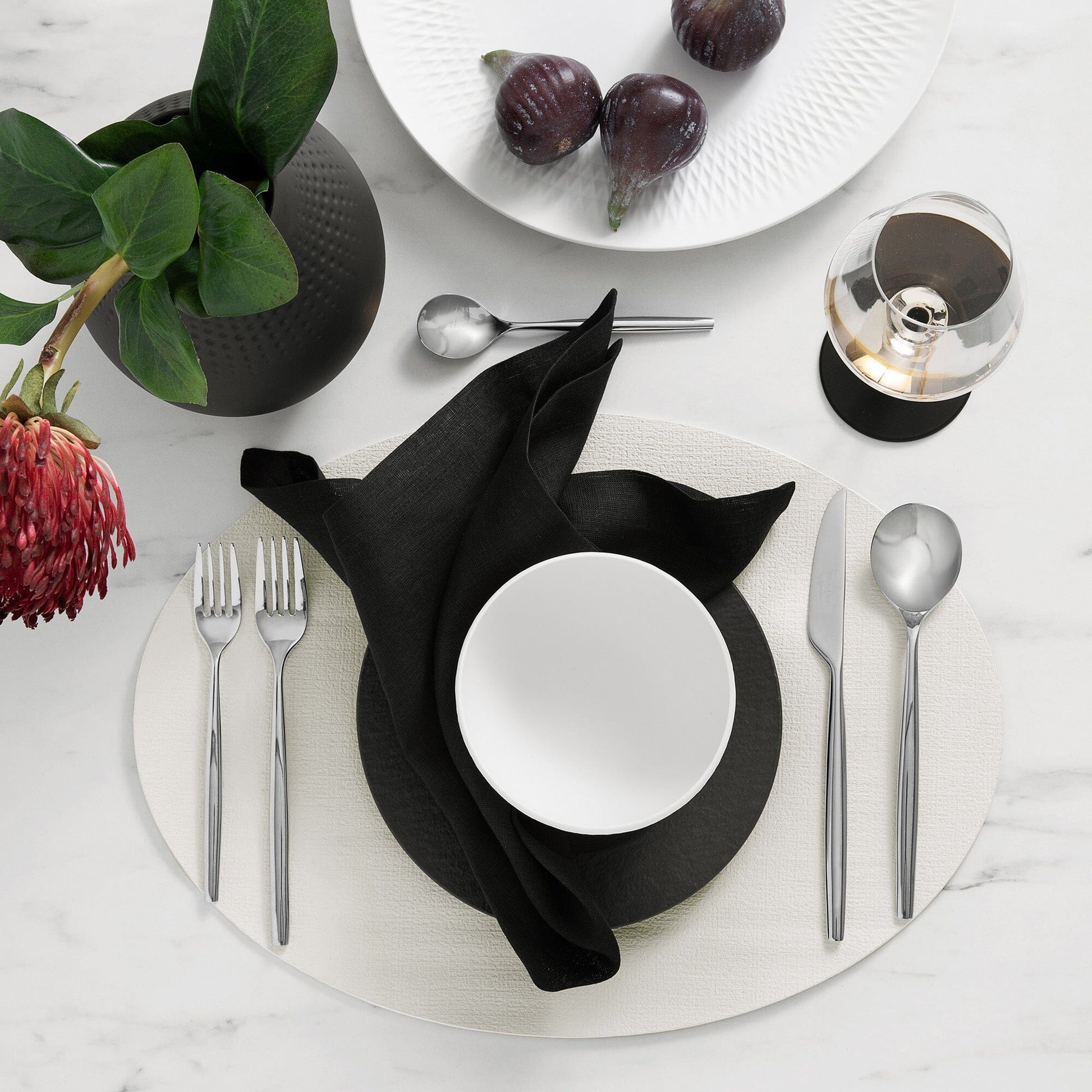 Los manteles individuales Manufacture Rock de Villeroy & Boch son el complemento perfecto para tu mesa transitoria y atemporal. Vendidos en un juego de cuatro, nuestros manteles individuales reversibles de cuero vegano tienen una textura que se ve y se siente como cuero real y al mismo tiempo ofrecen una alternativa respetuosa con el medio ambiente. Cada mantel individual de forma ovalada mide 12”x18” y viene en dos combinaciones de colores clásicos: blanco y negro sólido. Nuestros manteles individuales Manufacture Rock son extremadamente versátiles y protegerán su cocina o mesa de comedor de derrames y rayones. Hechos de polivinilo 100% duradero, nuestros manteles individuales ovalados son impermeables y antideslizantes, lo que los hace perfectos para cenas o comidas diarias.