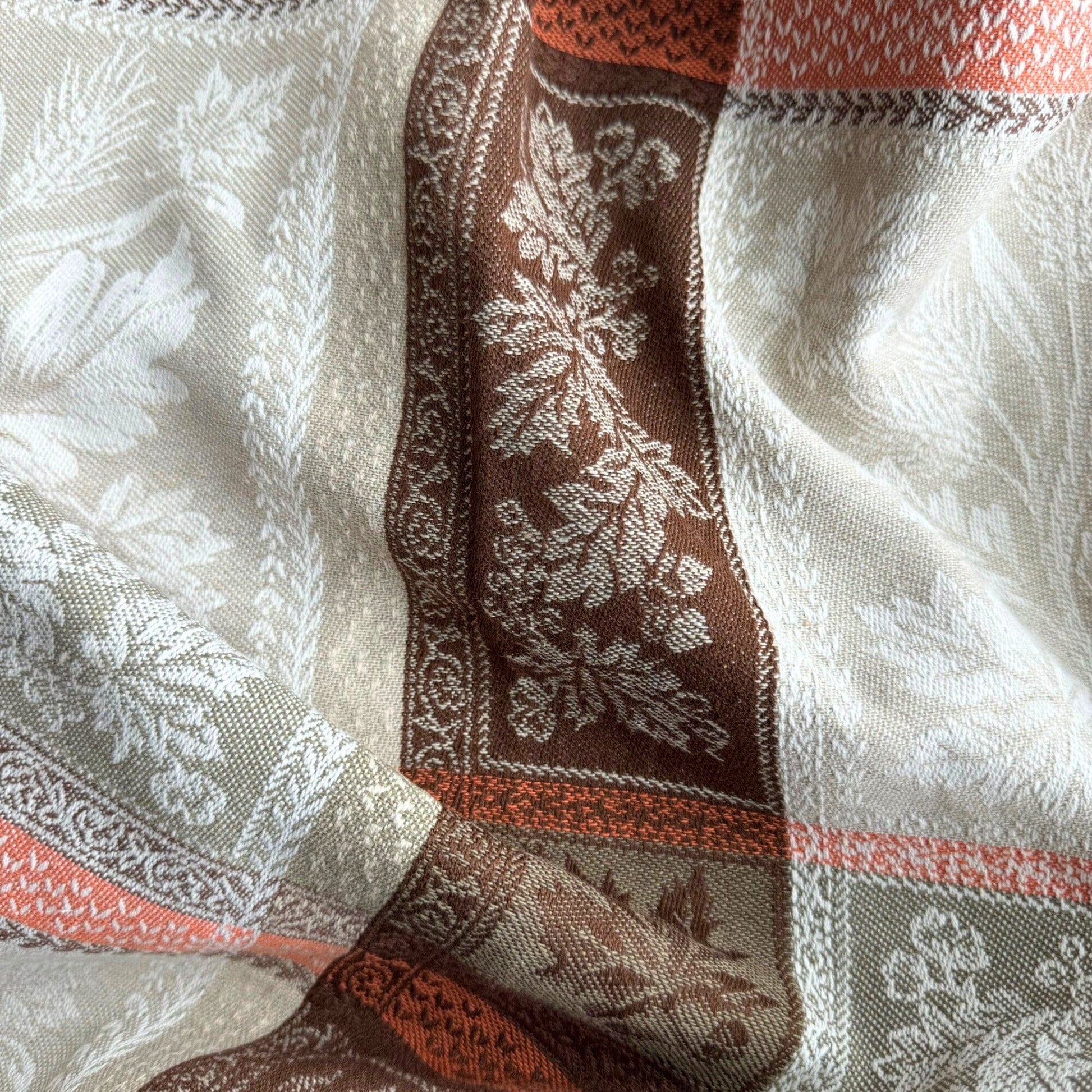 Featuring a delicate woven jacquard leaf design over a classic plaid, this set of lap napkins blends tradition and seasonal charm with a rich fall palette of brown, sage, and orange over an ivory ground.