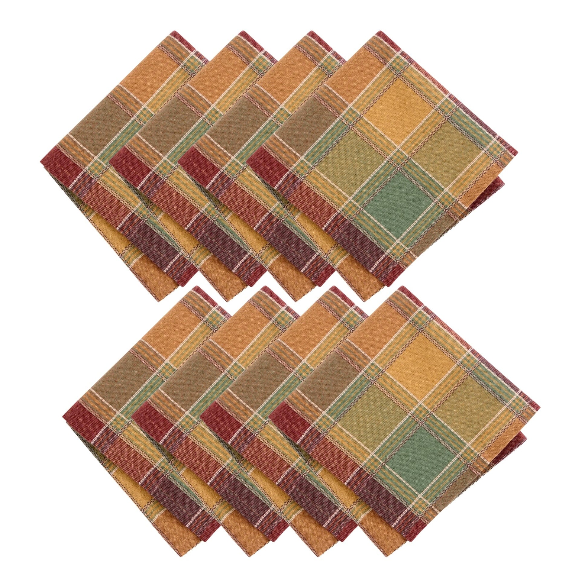 Bring a warm, rustic charm to your dining space this fall season with the Autumn Acres Napkin Set. Our set of 8 classic plaid napkins displays a nostalgic yarn-dyed design in rich autumn hues of burgundy, golden amber, sage green, and warm brown that compliments a variety of seasonal dinnerware. Woven from premium 100% cotton, these reusable napkins feature a hemmed edge for added durability. The sanforizing finish helps reduce shrinkage, keeping the fabric’s size and shape intact over time. Ideal for special occasions, events, parties, family gatherings and everyday use during the fall months. Easy care, machine washable for effortless maintenance. Complete the look by adding our coordinating Autumn Acres Tablecloth to your collection, available separately.
