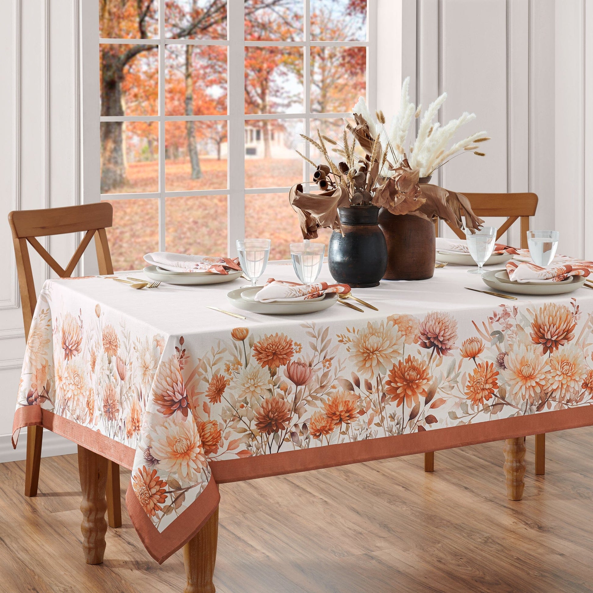 Inspired by the harvest, this tablecloth features autumnal flowers in golden fall colors to bring an inviting look to your tablescape.