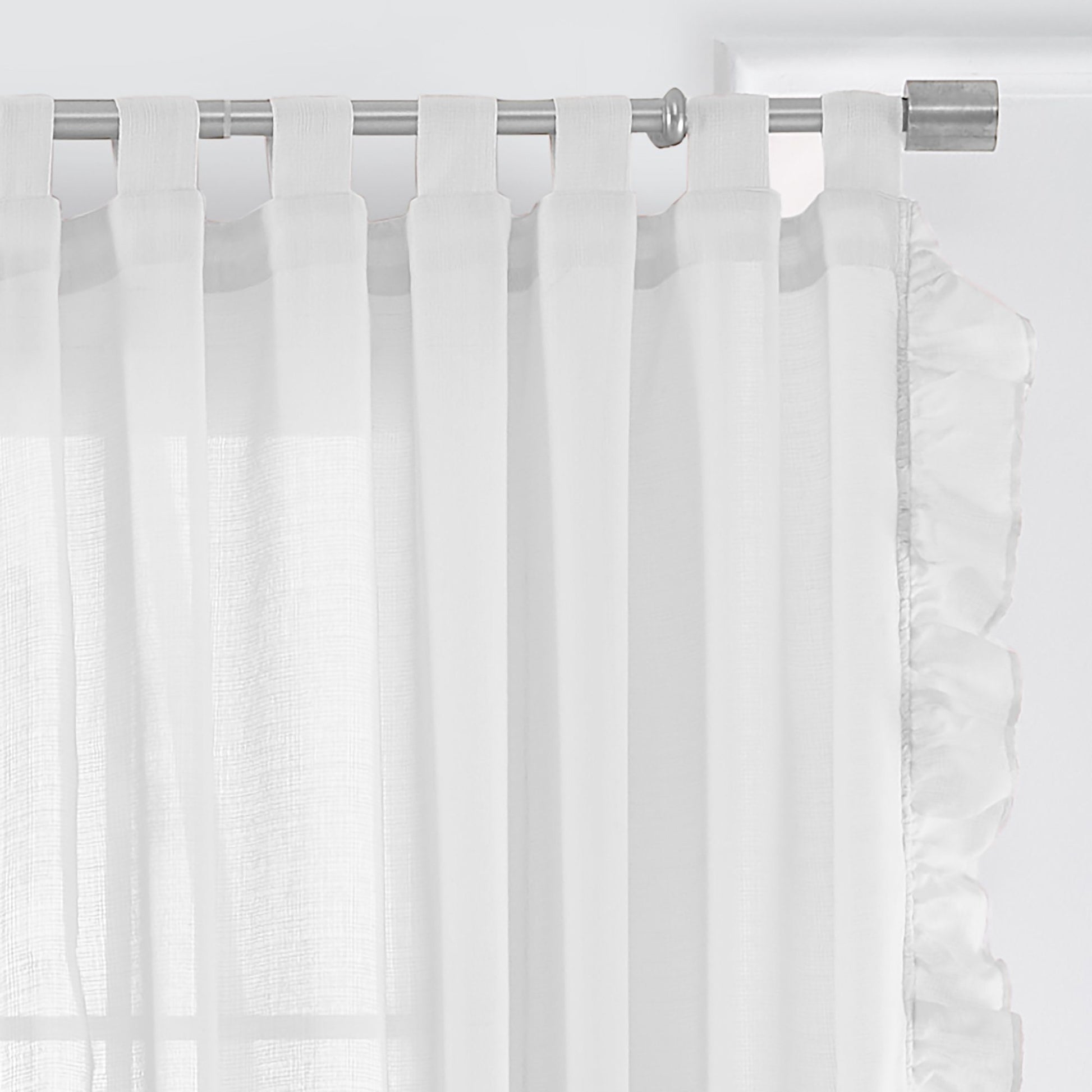 Charming and trendy, the Bella Tab-Top Ruffle Sheer Window Curtain Collection is sure to bring an upscale yet casual touch to any room in your home. Crafted using chic, sheer 100% cotton gauze, these versatile window panels can be used on their own as a standard curtain pair, tapestry door curtain, closet curtain or room divider. Featuring a beautiful ruffled edge, they are perfect for creating a light, breezy aesthetic and complement a wide variety of décor styles such as boho, vintage, and coastal. Curtain panels feature a three inch tab top header that is recommended with up to a one inch rod for maximum movement. Easy care, machine washable.