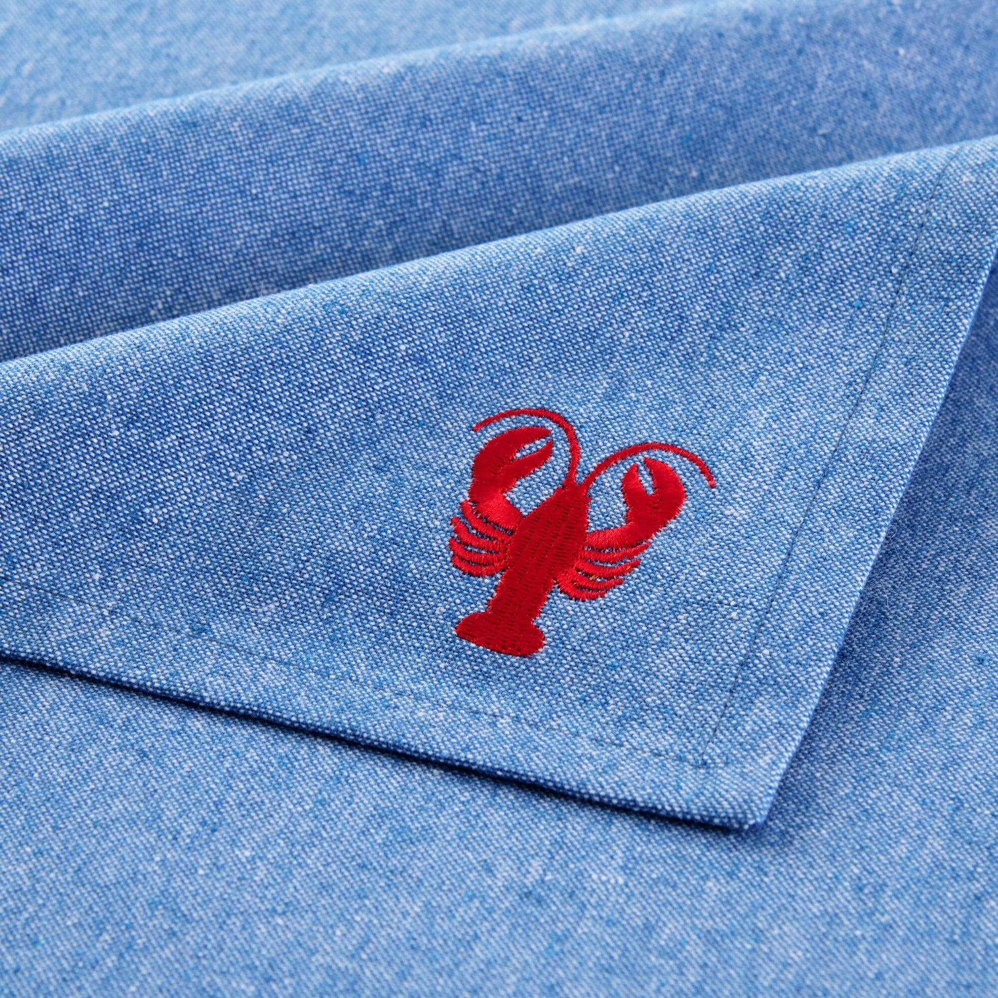 Bring seaside charm to your dining table with the Coastal Embroidered Napkin Set of 4. Each decorative napkin features a beautifully embroidered coastal icon - a lobster, crab, seashell, and starfish – in rich nautical hues of red and navy. Crafted from 70% recycled cotton and 30% recycled polyester in a washed chambray blue, these napkins add a casual yet refined coastal touch to any meal. Perfect for summer gatherings, beach house dining, or everyday use, this reusable napkin set blends durability with coastal style for effortless entertaining all season long.