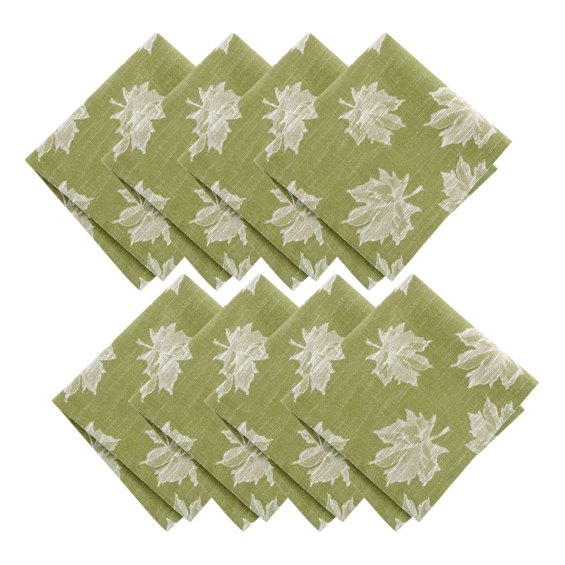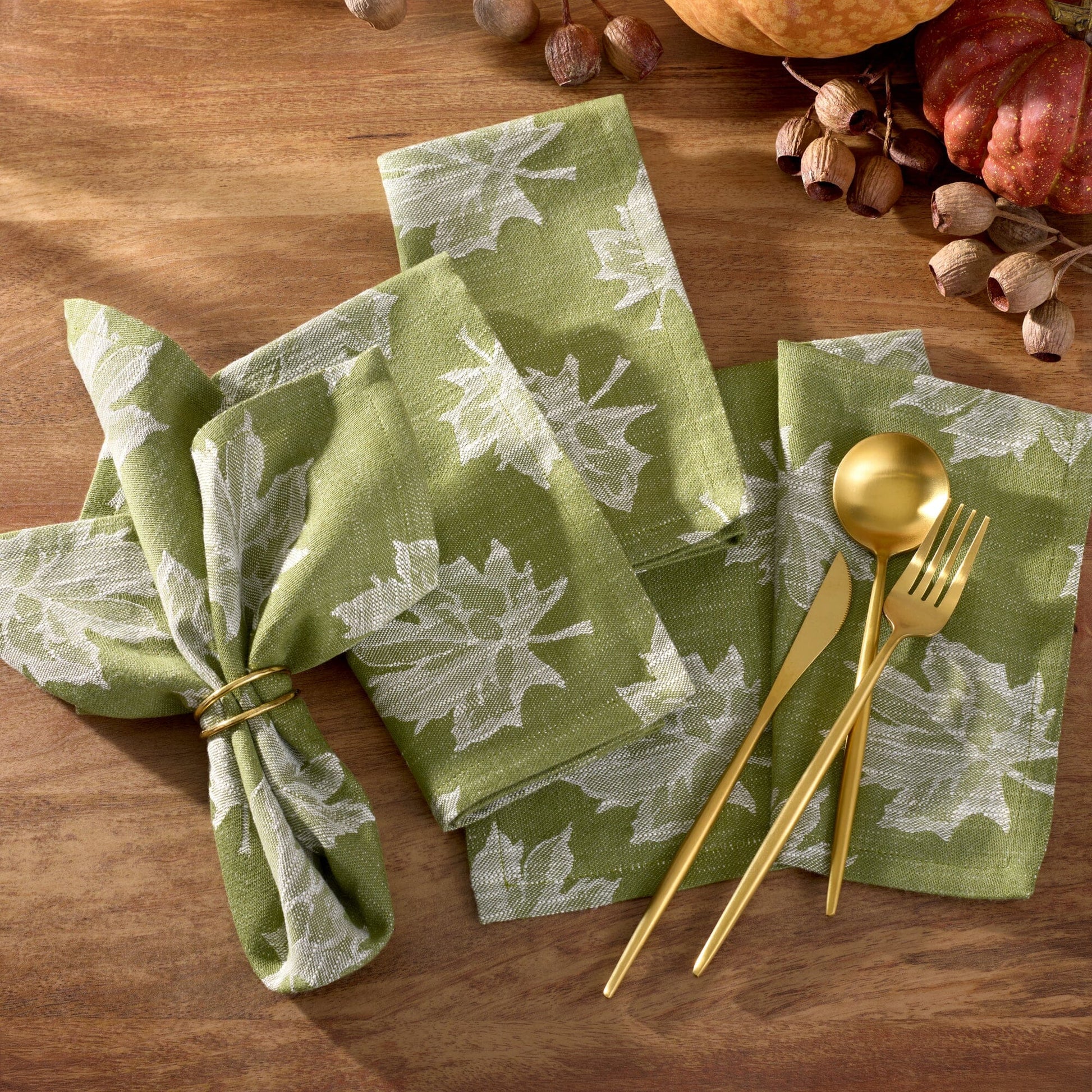 Bring the rich textures of autumn indoors with the Falling Leaves Jacquard Napkin Set. Inspired by the season's elegance, this sophisticated set of 8 napkins features a timeless off-white jacquard maple leaf motif, adding texture and depth to your tablescape. Available in three rich seasonal shades—green, taupe, and sienna—this versatile collection complements a variety of fall décor and dinnerware styles. Woven from premium 100% cotton, this napkin set features a hemmed edge for added durability. The sanforizing finish helps reduce shrinkage, keeping the fabric’s size and shape intact over time. These reusable cloth napkins are perfect for Thanksgiving, seasonal celebrations, events, parties, family gatherings, and everyday dining throughout the harvest season. Easy care, machine washable for effortless upkeep. Coordinate to the Falling Leaves Jacquard tablecloth to complete the look.