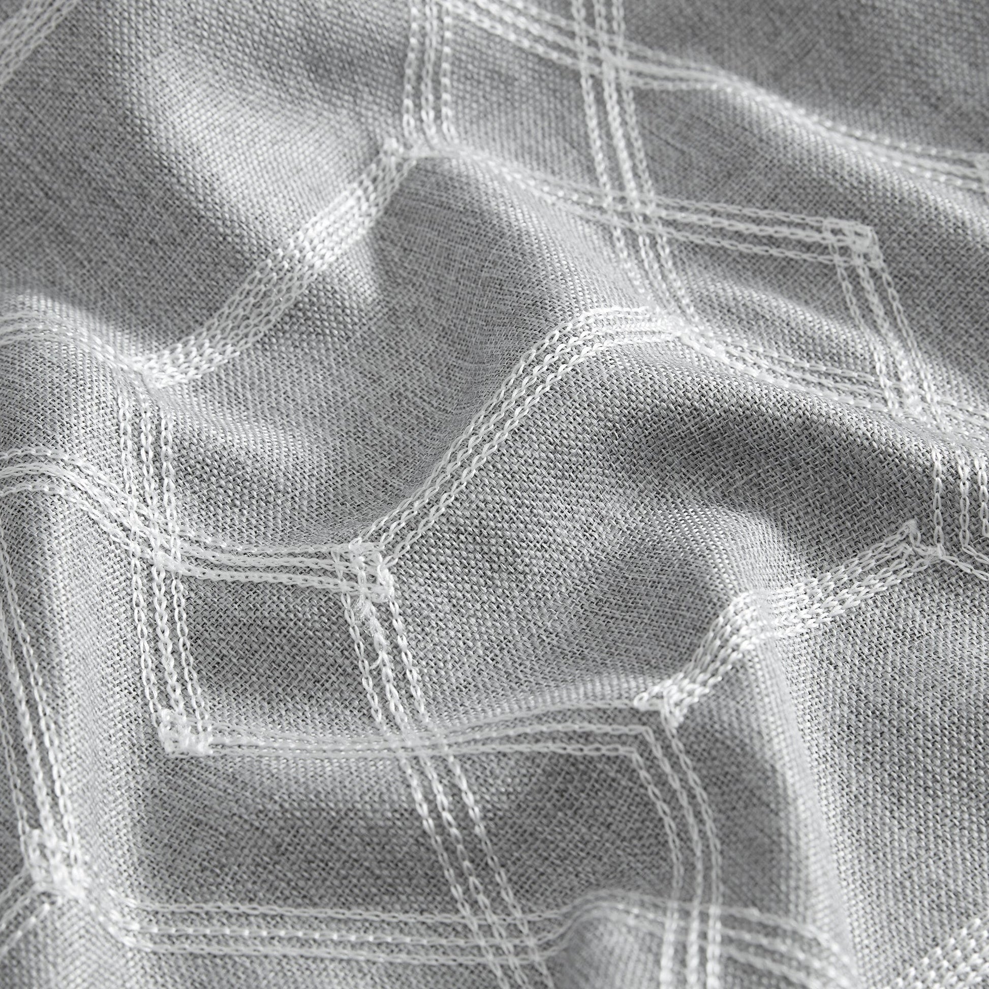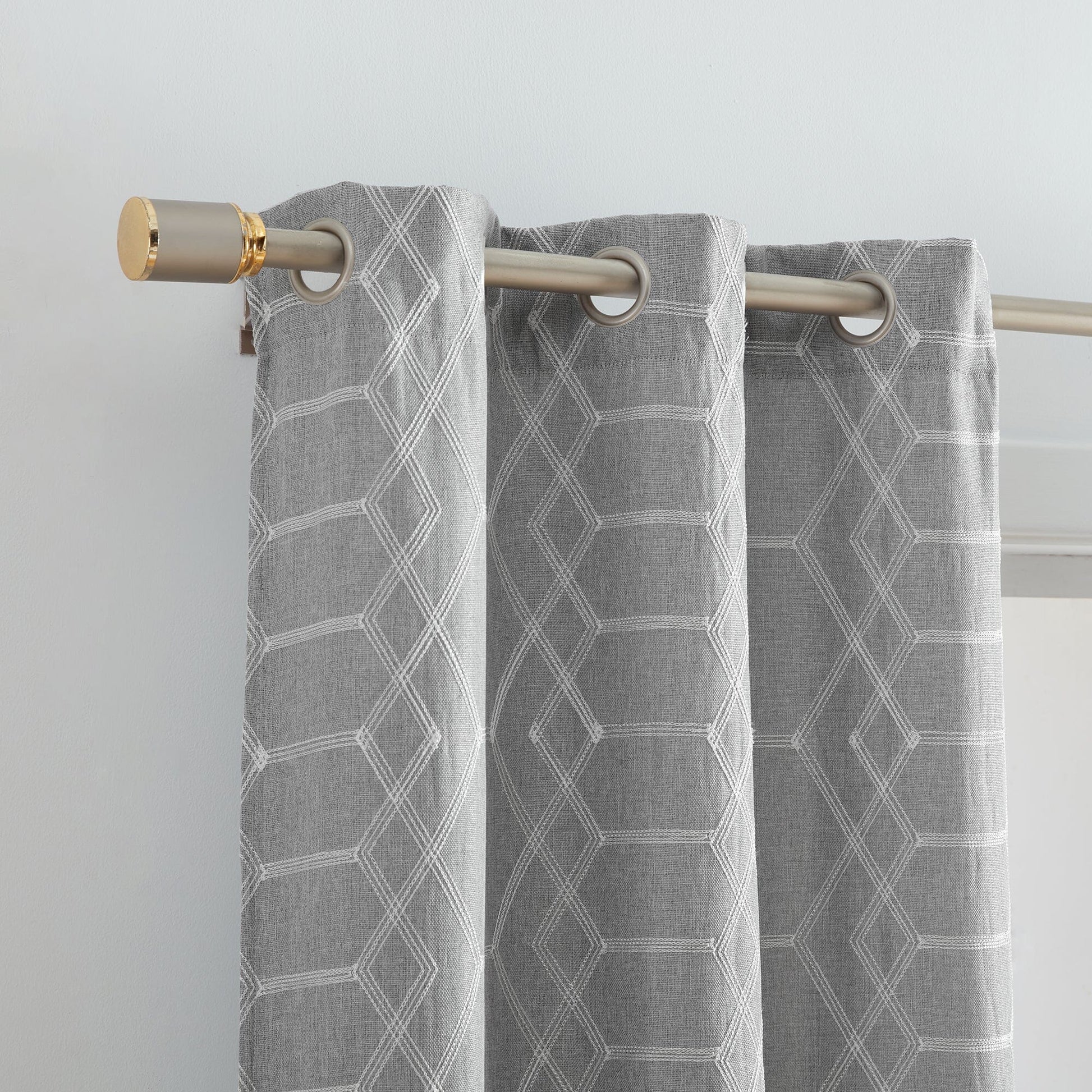 Elevate your living space with our Kendal Geometric Embroidered Blackout Window Curtain Panel, Set of 2. Designed to combine style and functionality, these panels showcase a versatile honeycomb inspired embroidered geometric pattern and offer both room darkening and blackout benefits. Crafted from high-quality 100% polyester fabric with a linen look, these panels are woven with durable blackout yarns to block out light, noise and to help insulate windows. Ideal for bedrooms, living rooms, nurseries, home offices and more. Equipped with 1.57-inch brushed nickel grommets, each curtain panel features 6 sturdy grommets across the header ensuring easy and smooth gliding while adding a touch of modern elegance to any room in your home. Sold as a set of two, each window panel measures 37 inches wide by either 63 or 84 inches long. 100% Polyester. Easy care, machine wash cold in gentle cycle. Tumble dry low. Cool iron as needed.