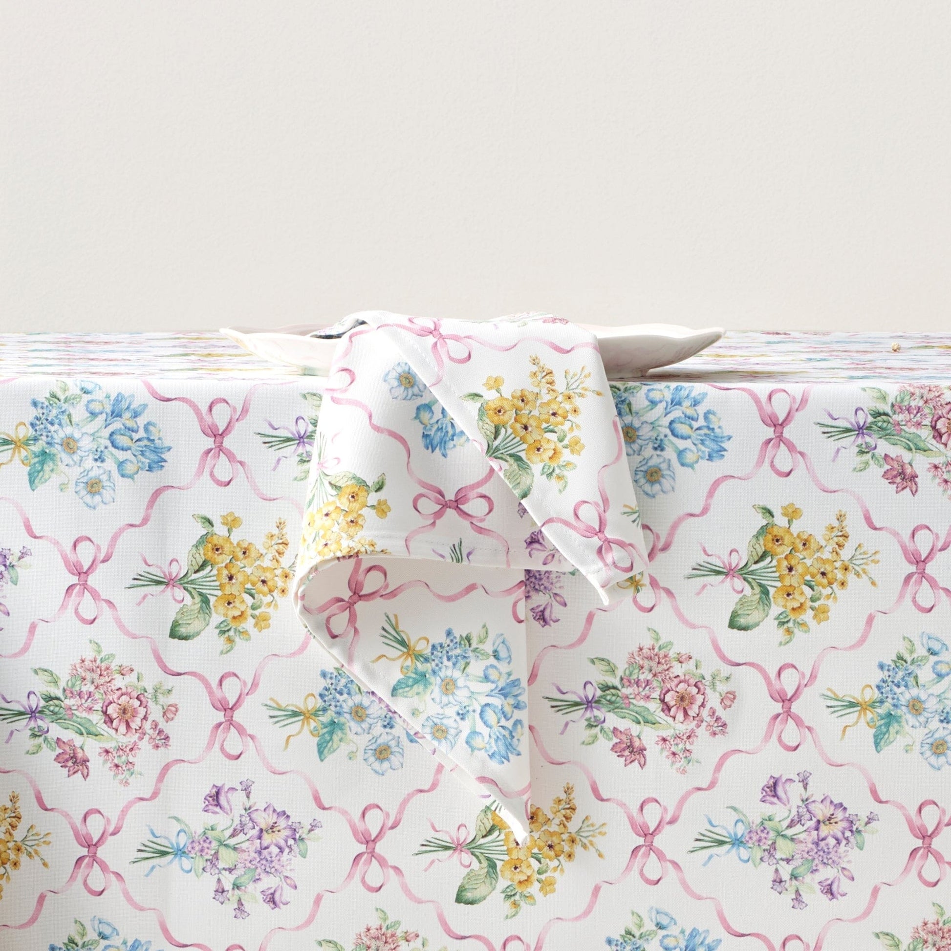 Bring a touch of timeless elegance to your dining table with the Lenox Bouquet Ribbon Napkins. This charming set of four napkins features a delicate allover pattern of watercolor floral bouquets framed by a soft ribbon lattice, bringing a graceful, garden-inspired touch to any meal. The pastel blooms in lavender, blush, blue, and yellow evoke a fresh springtime feel, perfect for gatherings, brunches, holidays, or everyday dining. Each napkin measures 19 x 19 inches, offering generous coverage for a polished, elegant table setting. Crafted from 100% polyester, these napkins combine timeless elegance with easy-care convenience. The durable fabric resists wrinkles and everyday wear, ensuring they retain that just-set, fresh and inviting look for years to come.. Machine wash cold with like colors; use only non-chlorine bleach when needed; tumble dry low; warm iron if desired. For a coordinated look, pair these dining napkins with the matching Bouquet Ribbon tablecloth, placemats, and coordinating kitchen accessories to create a beautifully styled, timeless Lenox table.