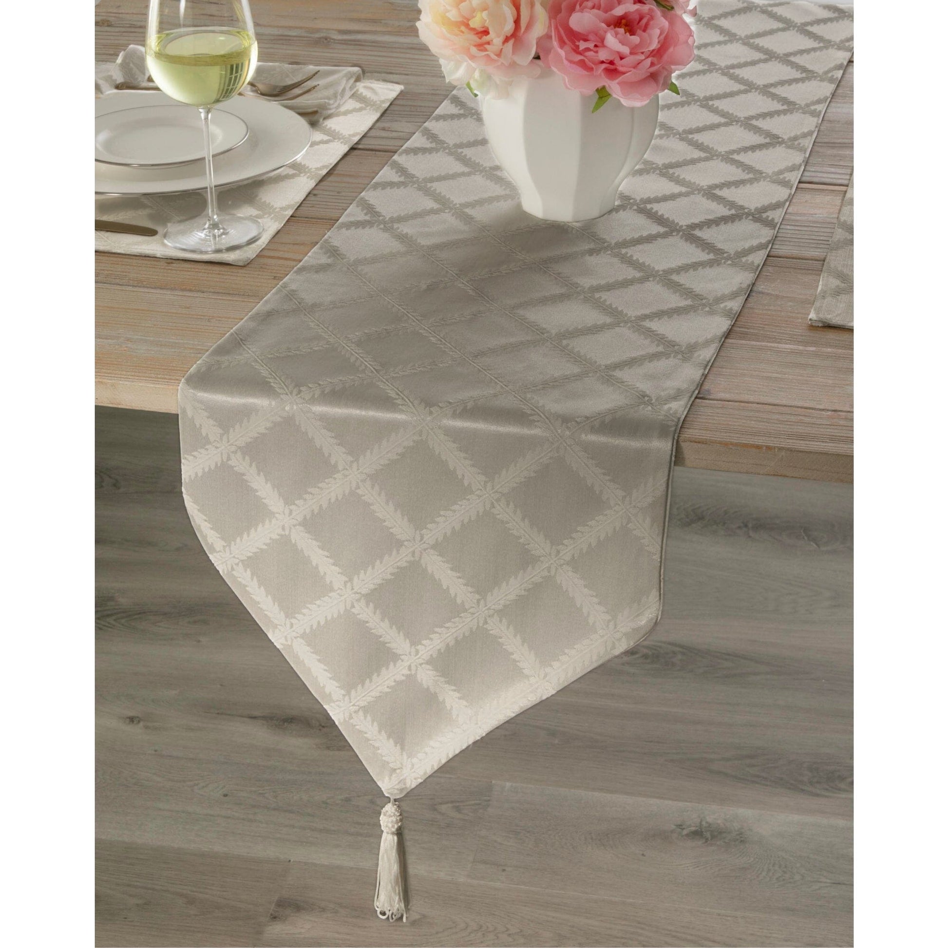 Enhance your table décor with the refined elegance of the Lenox Laurel Leaf Table Runner. Measuring 14" x 90", this stylish runner showcases a subtle leaf motif woven into a sophisticated fabric, adding gentle texture and understated charm to any space. Finished with classic pointed ends and tassel accents, it brings a touch of luxury and timeless appeal. Made from a durable cotton/polyester blend, this table or console runner combines the soft feel of cotton with the wrinkle resistance and easy care of polyester. Machine washable and available in multiple colors, it’s ideal for both everyday meals and special occasions. Complete your tablescape by pairing it with coordinating Laurel Leaf placemats, napkins, and tablecloths for a beautifully coordinated look.