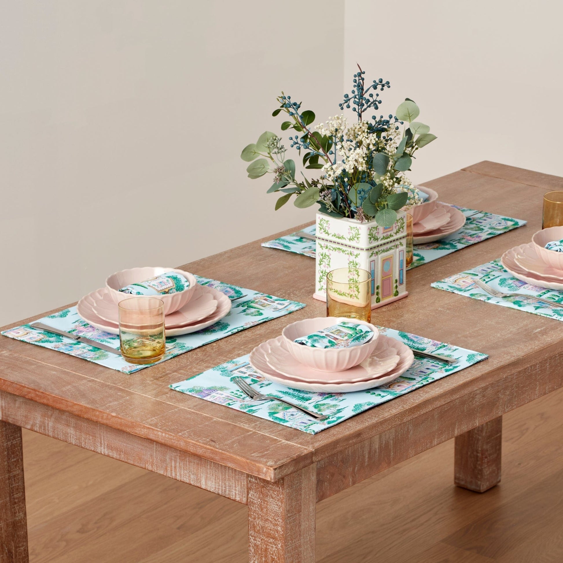 As lovely as it is whimsical, the Lenox Spice Village Allover Placemat Set captures the nostalgic storybook charm of the beloved Spice Village collection. Its picturesque design features pastel cottages and gardens in soft watercolor hues, set against a serene pastel blue background. This charming pattern brings warmth, color, and personality to any dining experience. Crafted from 100% polyester, these placemats offer both elegance and easy maintenance. The durable fabric resists wrinkles and everyday wear, ensuring they retain that just-set, fresh and inviting look for years to come.. Simply machine wash cold with like colors, use only non-chlorine bleach when needed, tumble dry low, and warm iron if desired. Each place setting measures 13 x 19 inches, offering generous coverage for a polished, elegant table setting. Complete your charming kitchen or dining room with other pieces from the Lenox Spice Village collection, including the Spice Village jar sets, accent décor, coordinating table linens, and kitchen accessories, all designed to complement one another beautifully.