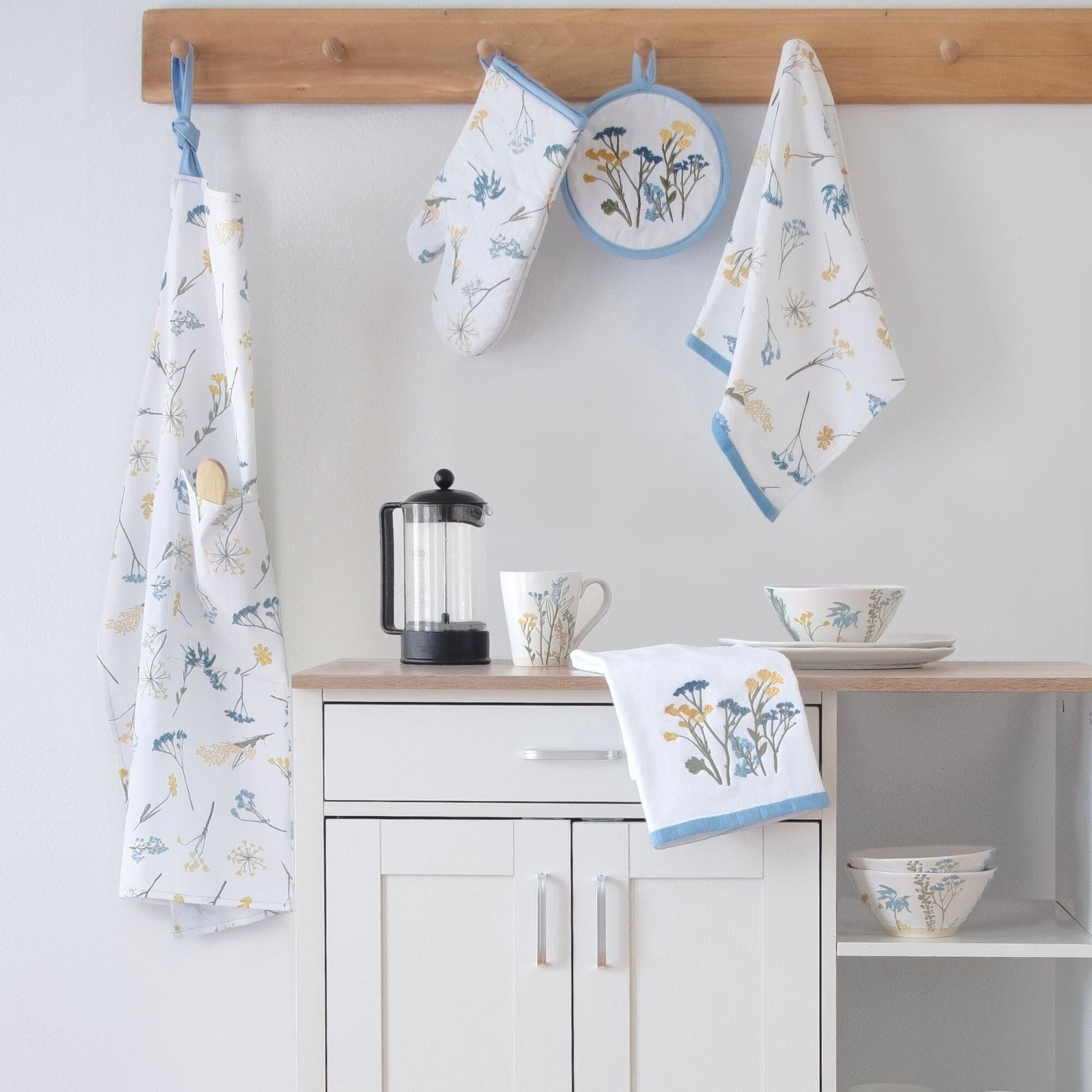 Coordinated Set of 2: Includes one towel with an allover wildflower print and one towel with an embroidered floral bouquet to add a touch of natural and timeless elegance to your kitchen.