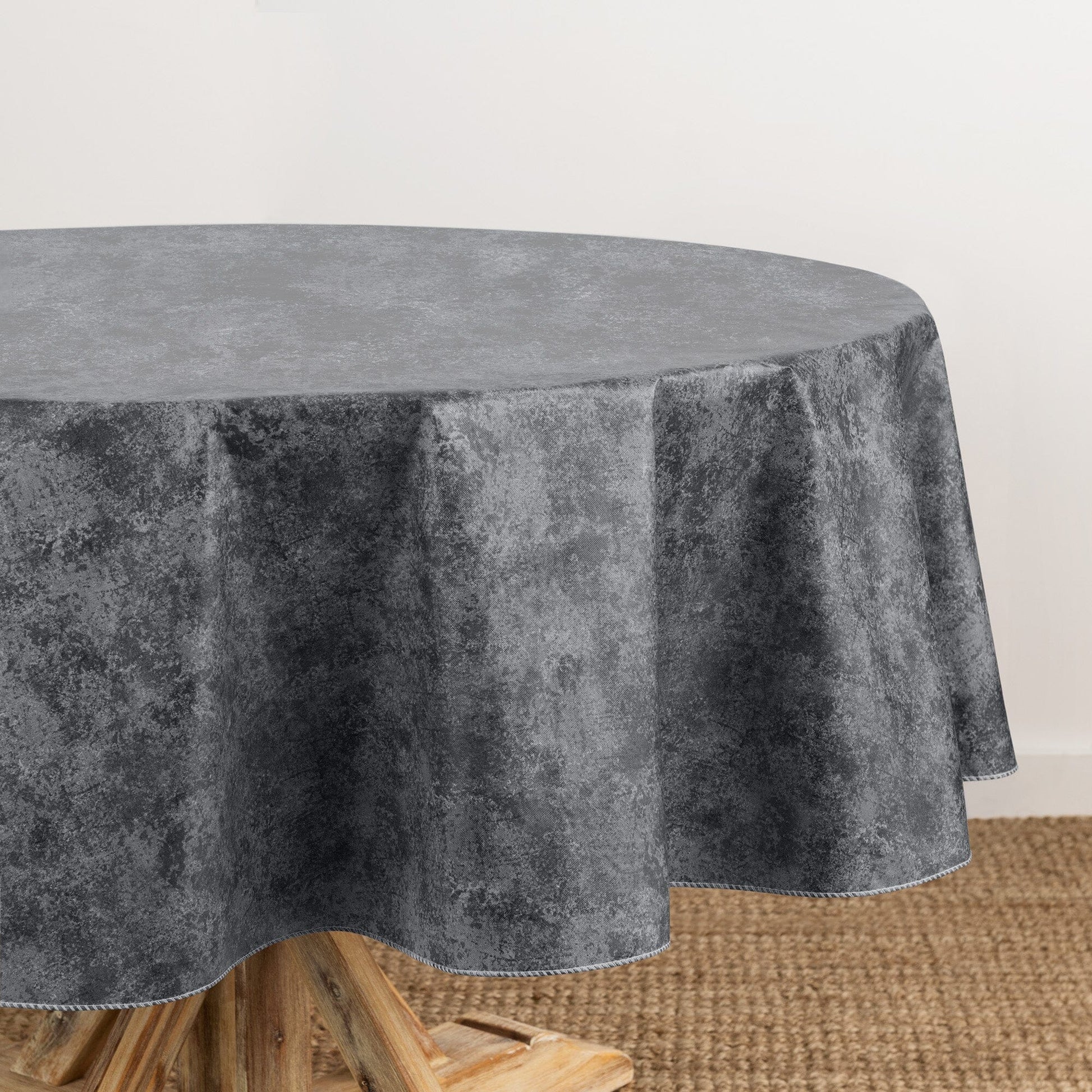 Vinyl face fabric is water and stain resistant and wipes clean with a damp cloth or sponge. Flocked backing can be steamed to release unwanted creases and keep your tablecloth wrinkle free.