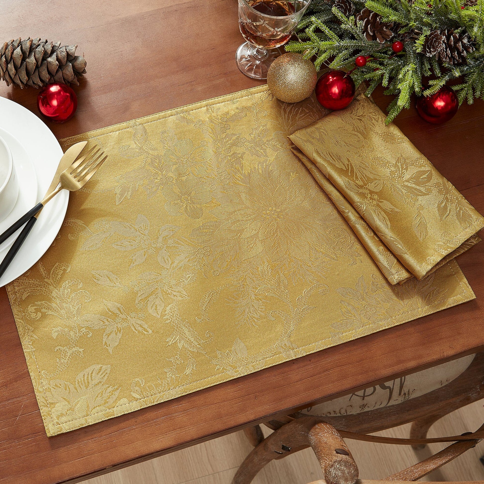 The Poinsettia Elegance Woven fabric napkin set is the perfect solution to your decorating and table linen needs. Delicately woven jacquard poinsettia design gives it the versatility of a solid, with a touch of fashion. Excellent for special occasions, events, holiday parties, family gatherings and everyday use during the holiday season. These napkins have the soft hand of an ordinary napkins, with the added function you need. Silky fabric can be ironed to release stubborn creases and make your napkins wrinkle free. Hemmed edge adds a finished look and prevents wear and tear. Napkins measure 17x17 and are sold as a set of 4. 100% Polyester. Easy care, machine washable. Coordinate to Poinsettia Elegance tablecloth and placemats to complete the look.