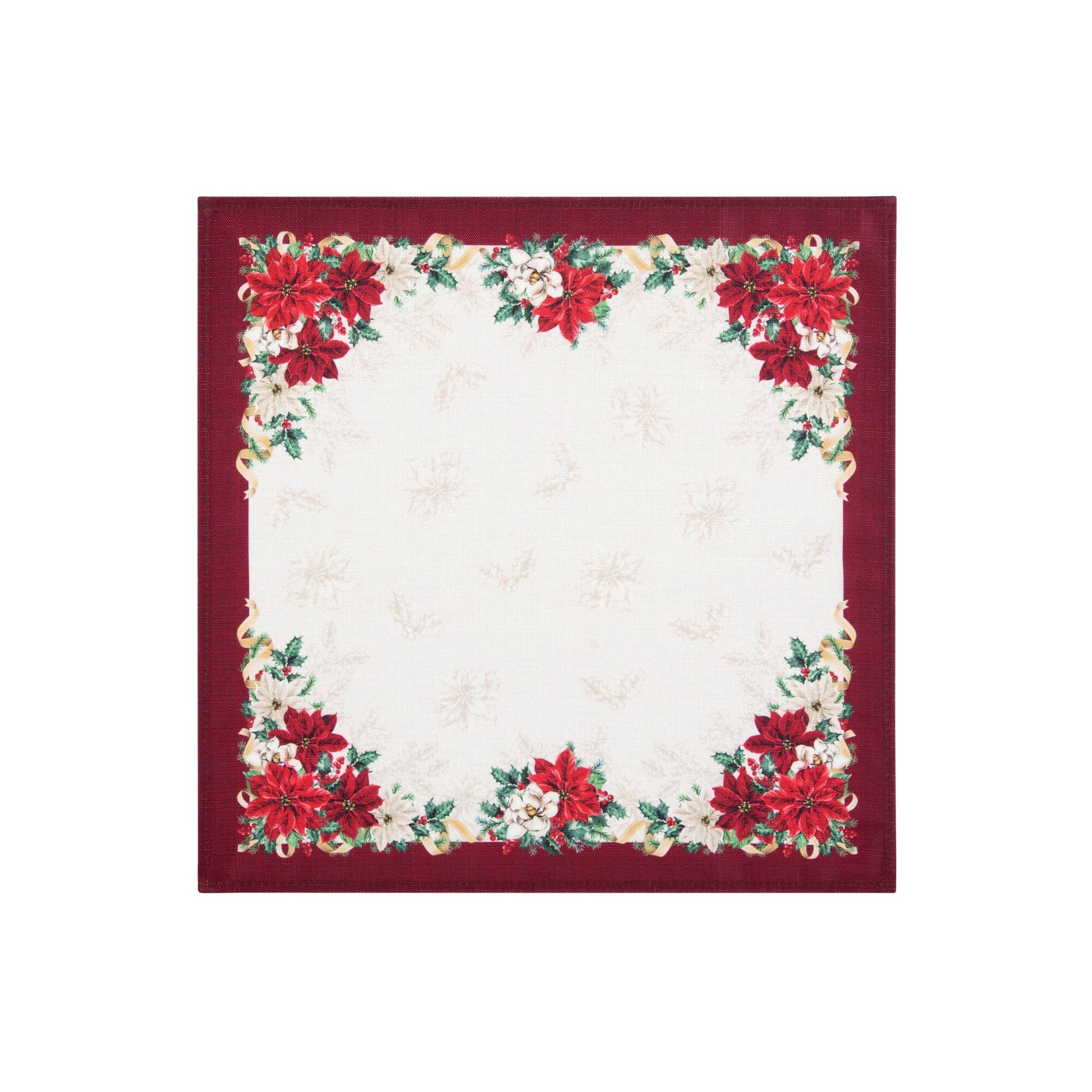Dress your table in holiday elegance with the Poinsettia Garlands Napkin Set of Four. Inspired by traditional winter-holiday décor, this charming fabric napkin set is decorated with deep red and cream colored poinsettia flowers, along with other seasonal blooms, green holly and berries, and gold ribbon accents. On soft ivory ground, these reusable napkins also feature a classic garnet red bordered design for a festive touch. Excellent for special occasions, events, Christmas parties, family gatherings and everyday use during the winter months and holiday season. Soft and durable fabric can be ironed to release stubborn creases and keep your lap napkins wrinkle free. Hemmed edges add a finished look and prevent wear and tear. Napkins measure 17”x17” and are sold as a set of 4. 100% Polyester. Easy care, machine washable. Coordinate to Poinsettia Garlands tablecloth, placemats, and table runner to complete the look.