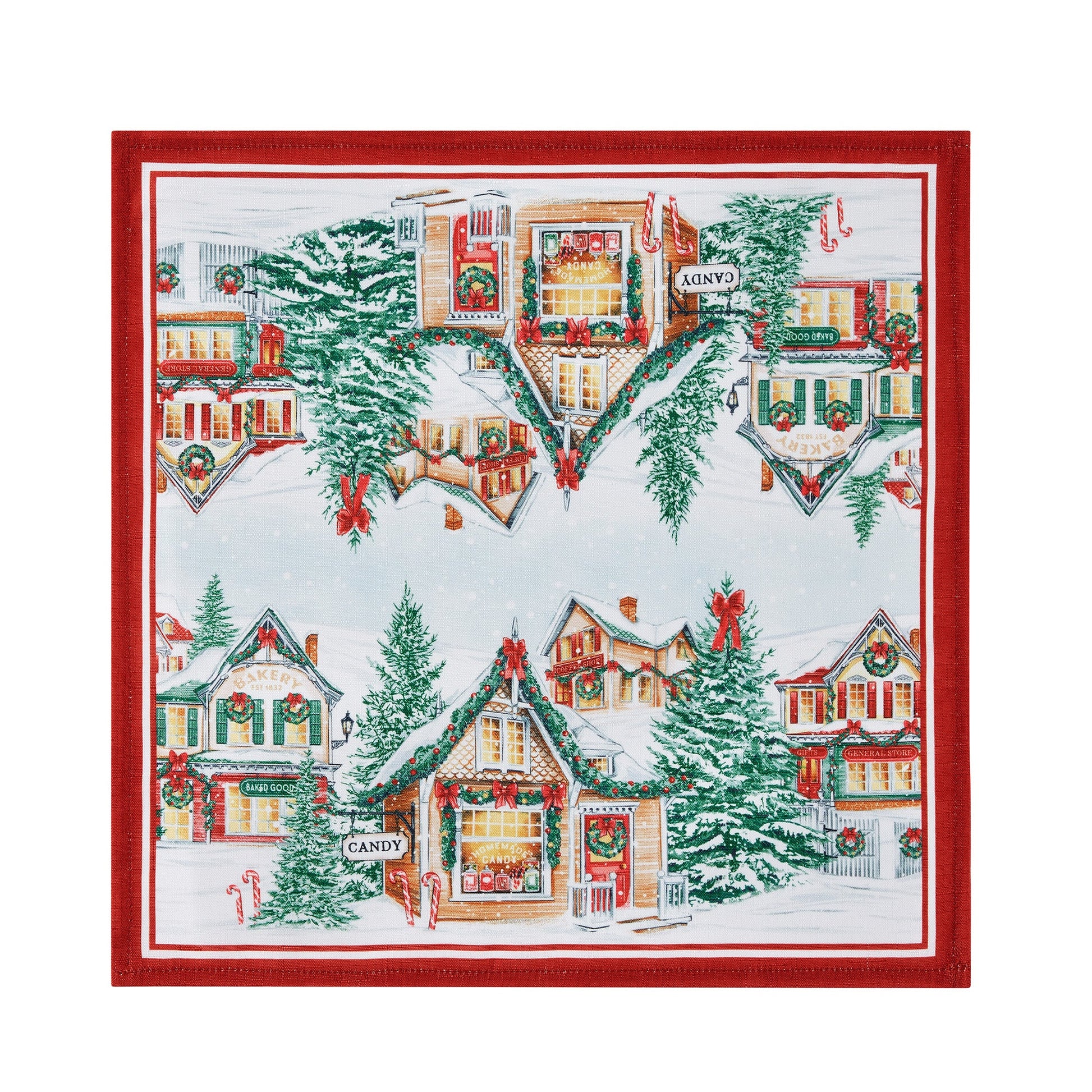 The Storybook Christmas printed napkins bring a charming, nostalgic look to your table setting throughout the Christmas and holiday season. Inspired by beloved Christmas stories, this napkin set is decorated with a quaint, snow-covered holiday village, green pine trees, and festive garland with red bows and ornaments. On soft white ground, it also features a classic red double bordered design. Excellent for special occasions, events, parties, family gatherings and everyday use during the winter months and holiday season. Soft and durable fabric can be ironed to release stubborn creases and keep your napkins wrinkle free. Hemmed edge adds a finished look and prevents wear and tear.