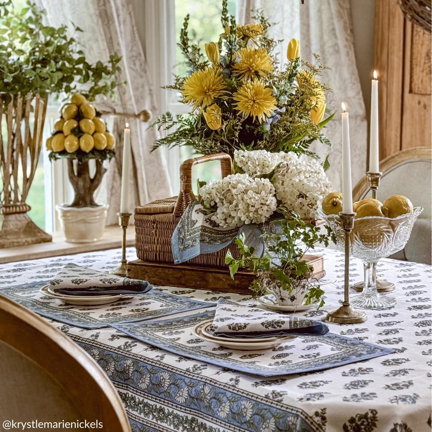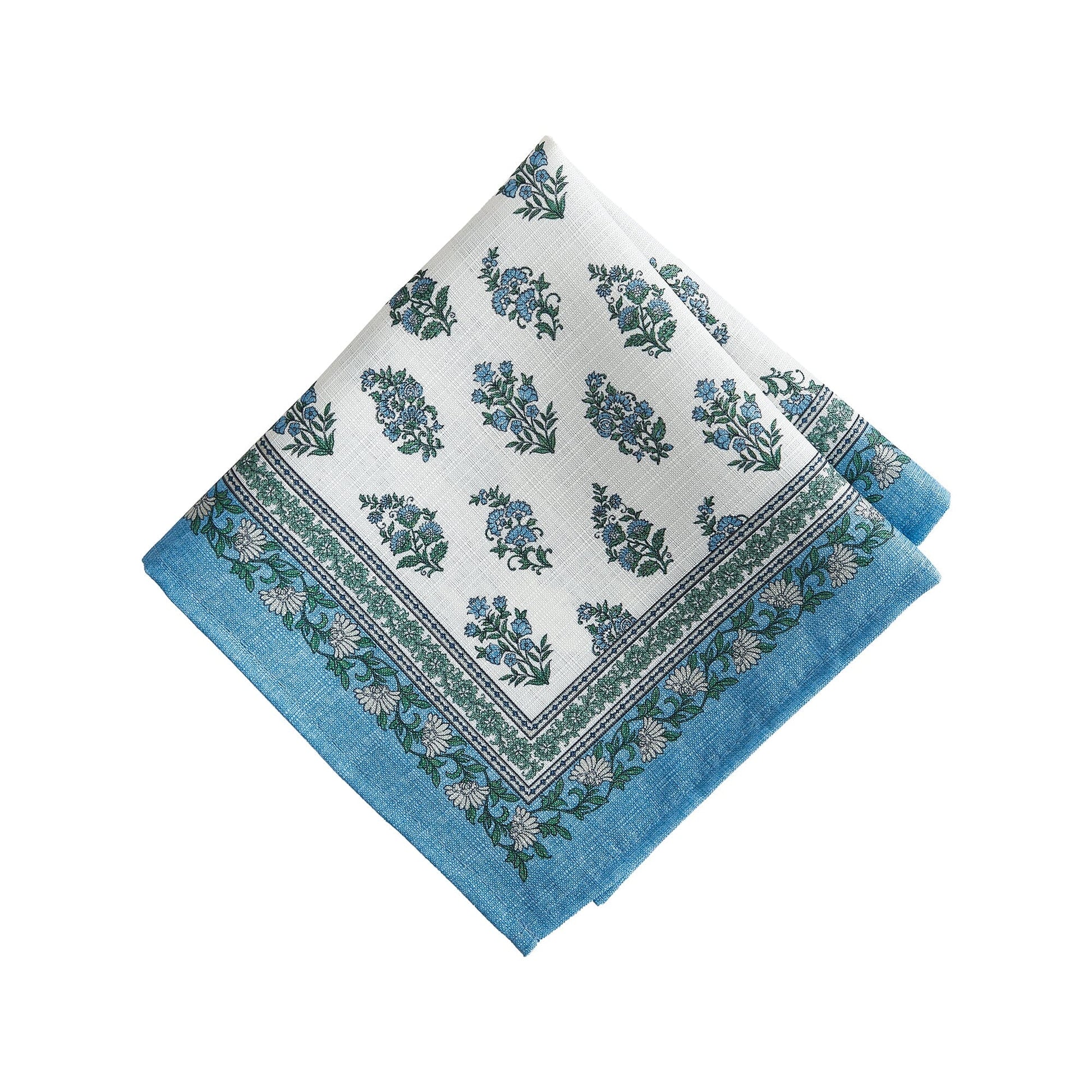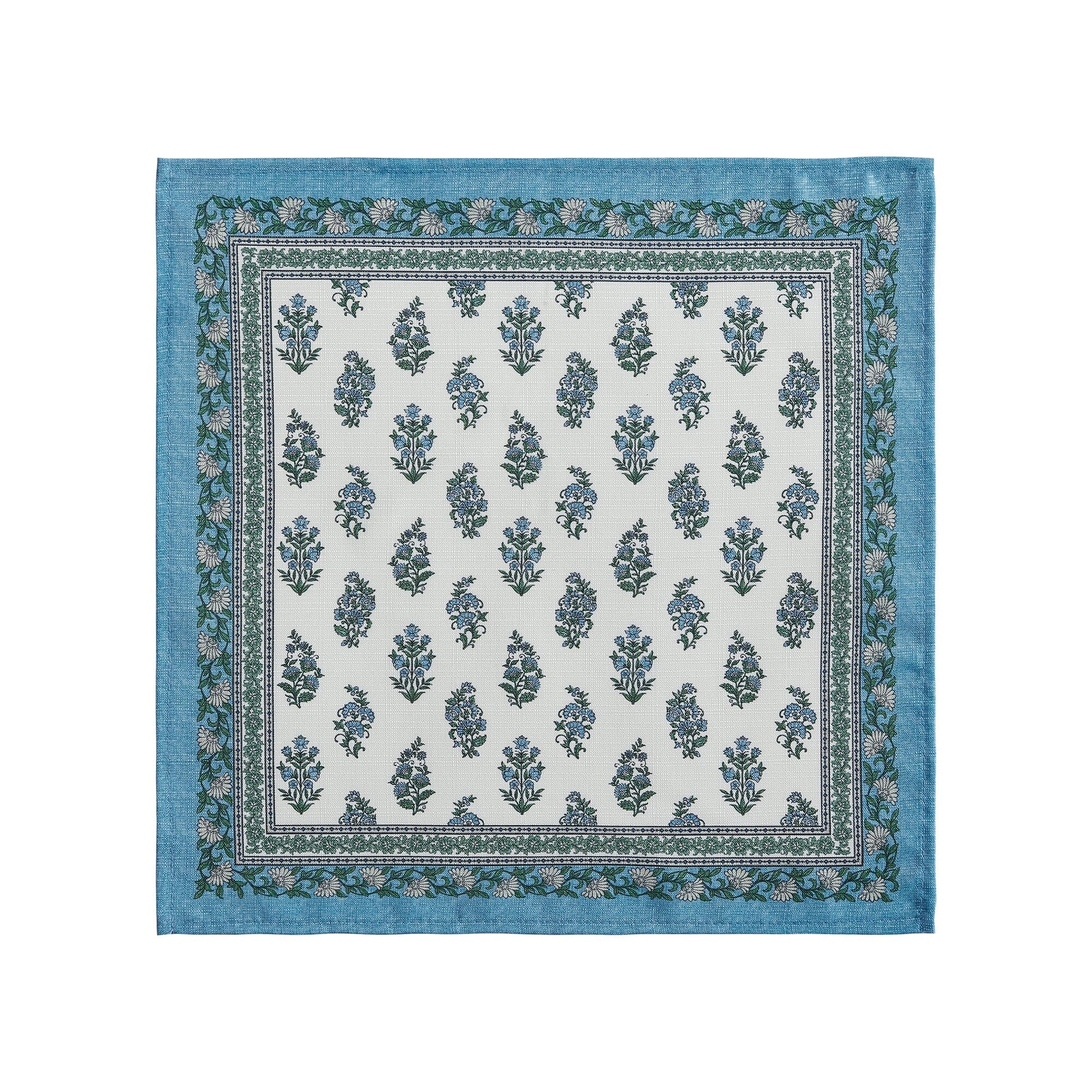 Introducing the Tropez Block Print Indoor/Outdoor Napkin Set - where style meets functionality. Elevate your dining experience with our reusable cloth napkins, designed to bring a touch of casual elegance to any table setting. Crafted with meticulous attention to detail, these napkins feature a paisley block print design in warming shades of blue and green on a solid white ground complimented by an ornate border design. Constructed from 100% polyester, these napkins feature stain and water-resistant properties, making them an ideal addition to your indoor or outdoor family gatherings year-round. Sold as a set of four napkins, each measuring 17”x17”. Complete the look by adding our coordinating Tropez Block Print tablecloth, table runner, and placemats to your collection, available separately.