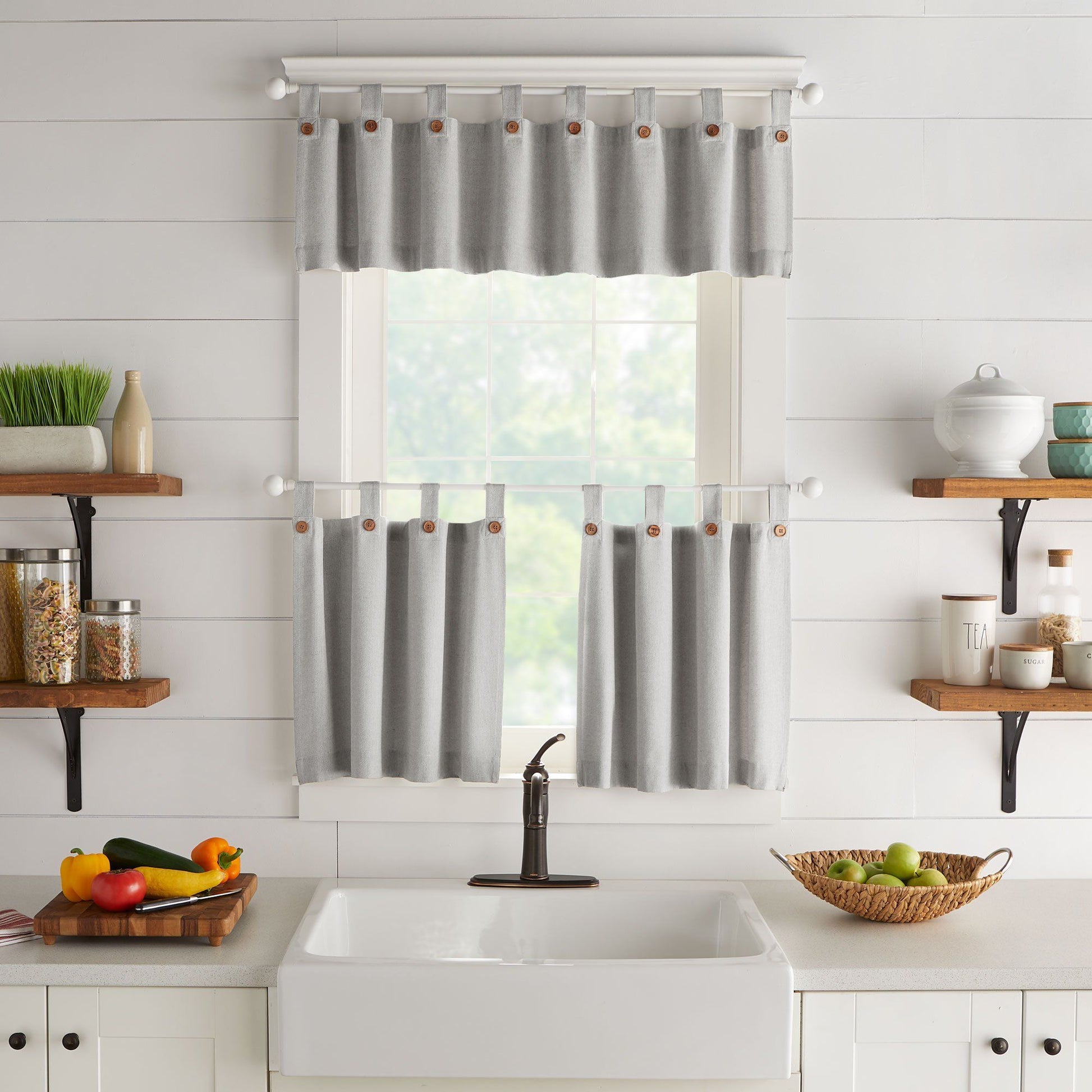 Stylish and versatile, the Tucker Solid Button Window Tier & Valance Collection is sure to bring a charming, coastal touch to your home. Featuring a decorative wooden button embellishment and a solid ground, this fashionable collection is perfect for creating a casual aesthetic that complements a wide variety of décor styles such as modern, cottage, farmhouse, and boho. This collection features a three inch tab top header that is recommended with up to a one inch rod for maximum movement. Header length is included in the overall length measurement. Window tiers are sold as a set of two; coordinating valance is sold separately as a single valance. Easy to care for, this light-filtering tier and valance collection is crafted from 100% cotton and is machine washable making it ideal for use in your kitchen, bathroom or as an accent to any small window.
