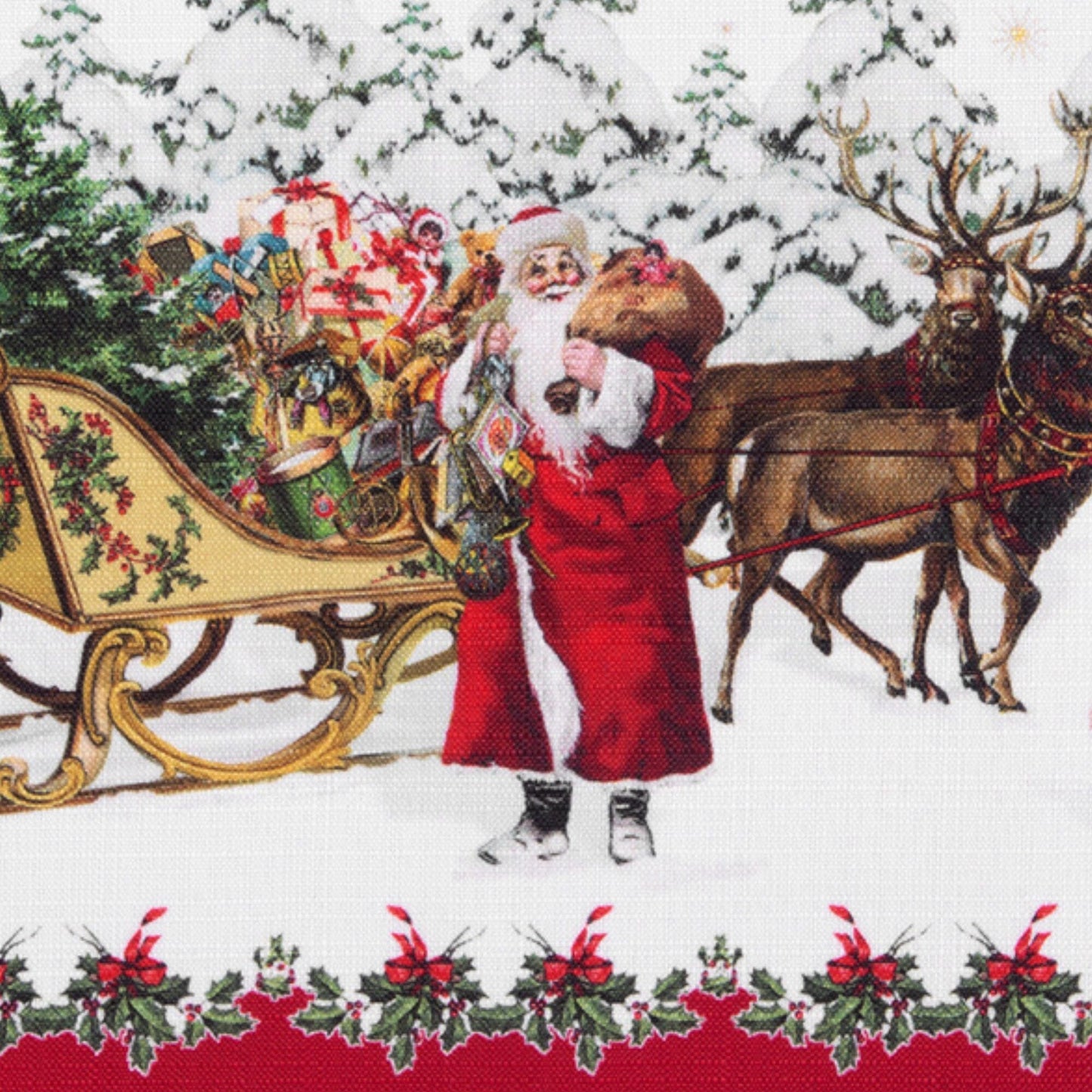 Inspired by the joy of Christmas, this fabric tablecloth features a snowy pine forest scene with St.Nick himself, along with a sleigh full of toys, his magic reindeer, ringing bells, and golden stars.